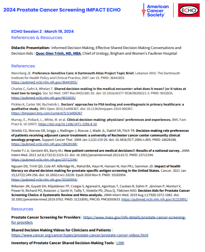 Prostate Cancer Screening IMPACT ECHO – Session 2 – 3.19.24 – Didactic Resources & Bibliography